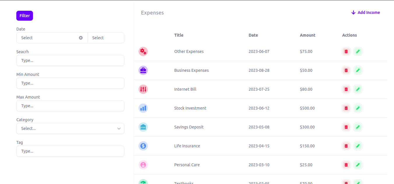 Track and manage your income sources efficiently. Keep a close eye on your earnings and gain insights into your cash flow.